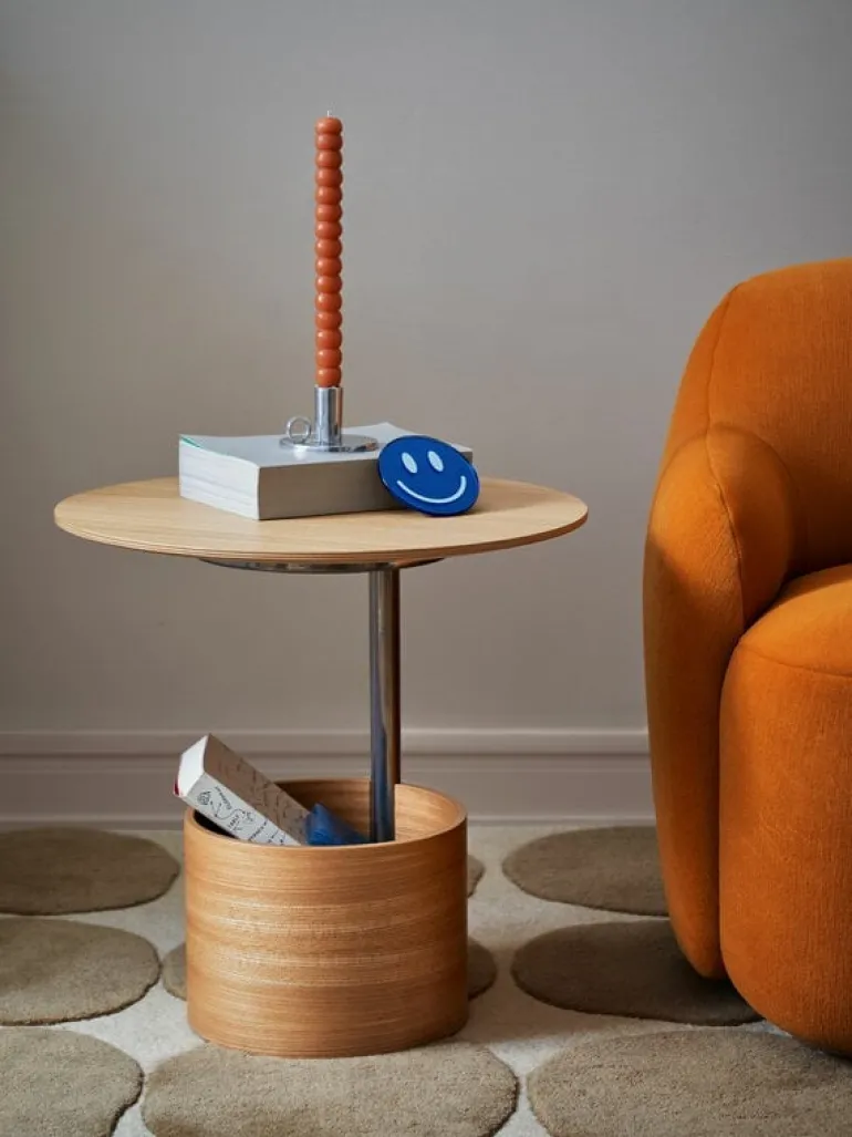 Soffbordets namn, Parasol, anspelar på just solskärmar, en skämtsam blinkning åt bordets form. Foten i trä fungerar även som förvaringskorg där du kan lägga böcker, leksaker eller hörlurar och fjärrkontroller, samtidigt som de döljs av bordsskivan. Ungefär som av ett parasoll. För att få till den utmanande strukturen tog Maze och Hartikainen hjälp av den svenska tillverkaren Steelnova, vars expertkunnande var till stor nytta för att kunna skapa en stabil konstruktion som speglade Hartikainens vision.