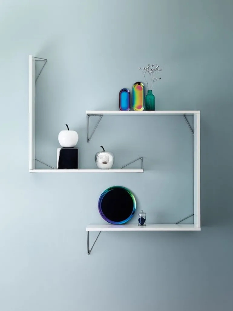 Pythagoras konsoler, hyllor och lådor ger dig friheten att skapa hyllor i olika storlek, färg och form var som helst. Använd dem som en enkel vägghylla, nattduksbord, hörnhylla, kökslådor eller ett stort hyllsystem som täcker en hel vägg. Konsolerna kan monteras antingen nedanför eller ovanför hyllan i fyra olika positioner, och deras luftiga design lämnar dessutom plats för fria ytor. Lek, experimentera och skapa den perfekta hyllan för dina egna behov!