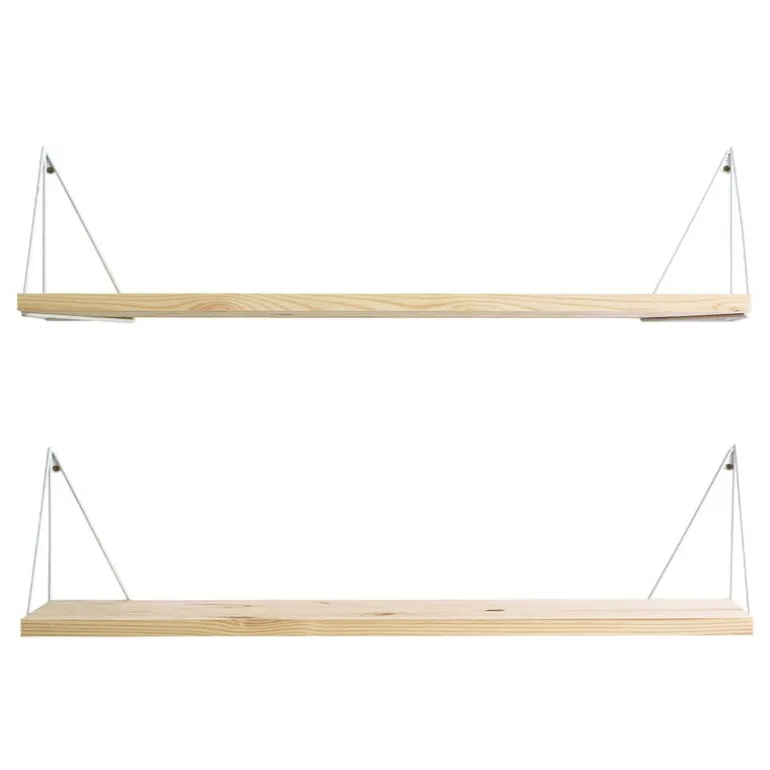 Pythagoras Play kommer i ett tvådelat set med fyra väggkonsoler i metall. Hyllornas furu produceras från