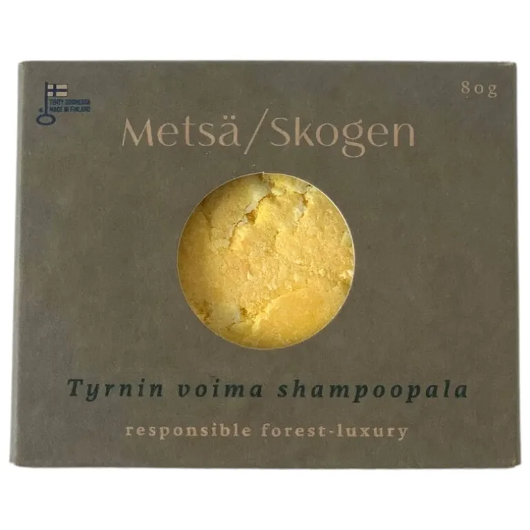 Schampokakan The Power of Sea Buckthorn från Metsä/Skogen är räddaren i nöden för torrt hår och känsliga hårbottnar. Schampokakan tillverkas för hand av uteslutande naturliga ingredienser: kokosoljebaserade ingredienser, havtornsolja, arganolja, jojobaolja, äppelcidervinäger och vit lera. Det friska, citrondoftande schampot ger lindring åt hårbottnen och gör håret mjukt och glänsande.