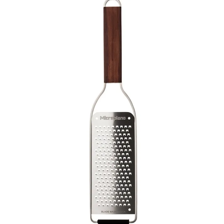 Microplanes Master Series Coarse rivjärn kan användas för hård ost, ingefära, morötter, nötter, kokosnöt, pepparrot och mer. De vackert tillverkade handtaget från Master Series är gjorda av amerikanskt valnötsträ och de halkfria gummiändarna ger rivjärnen extra stabilitet. Under 2017 vann rivjärnen från Master Series priset Red Dot Award.