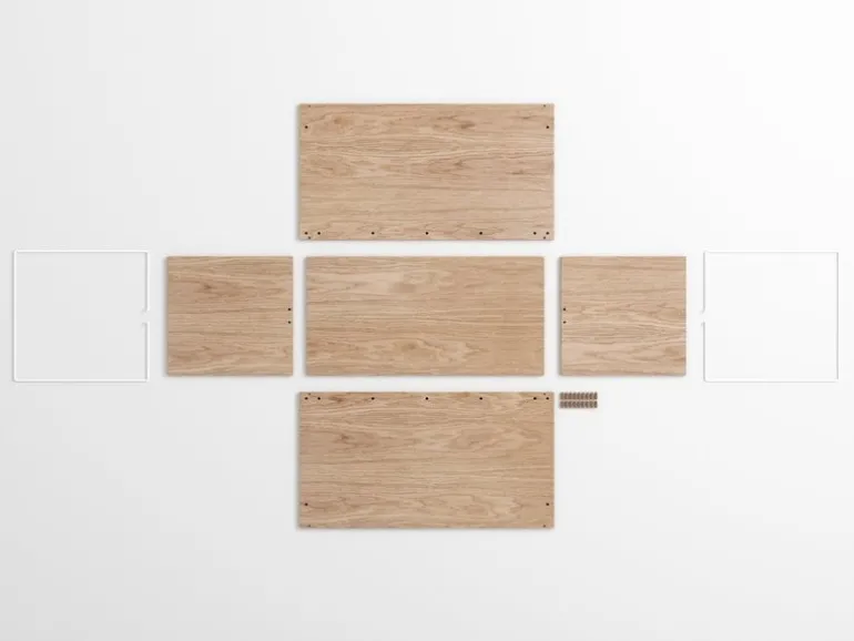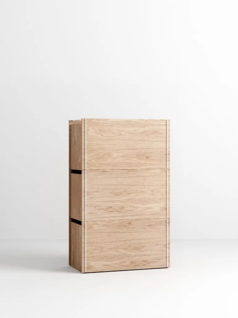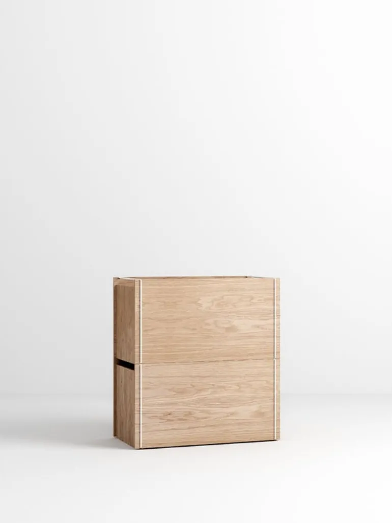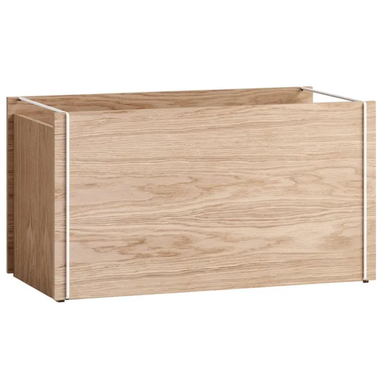 Moebes Storage Box ger tidningar, leksaker, kuddar eller mappar en minimalistisk och elegant förvaringsplats. Lådan är stapelbar och du kan ställa upp till tre av dem på varandra för att skapa ett förvaringssystem som inte tar upp så mycket plats. De kan lätt plockas bort igen, tack vare metallhandtagen. Förvaringslådan i trä kan även vändas på sidan eller upprätt, för att användas som nattduksbord eller ett litet sidobord.