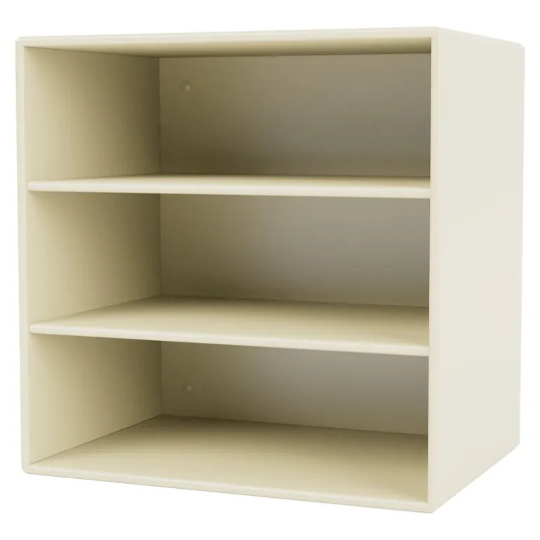 Montana Mini-modulen, bestående av tre hyllfack, är en enkel men extremt multifunktionell förvaringsmodul som kan monteras på väggen eller placeras på golvet, antingen individuellt eller i grupper. Modulen monteras på väggen genom att hänga den på den medföljande upphängningsskenan med små distanser – på detta sätt kan du enkelt omorganisera modulerna utan några verktyg och justera dem genom att rotera distanserna. Alla hörn på modulen har förborrade hål, vilket gör att du kan montera den på det sätt du vill. Inkluderade är också halkskydd för att stapla modulerna ovanpå varandra.