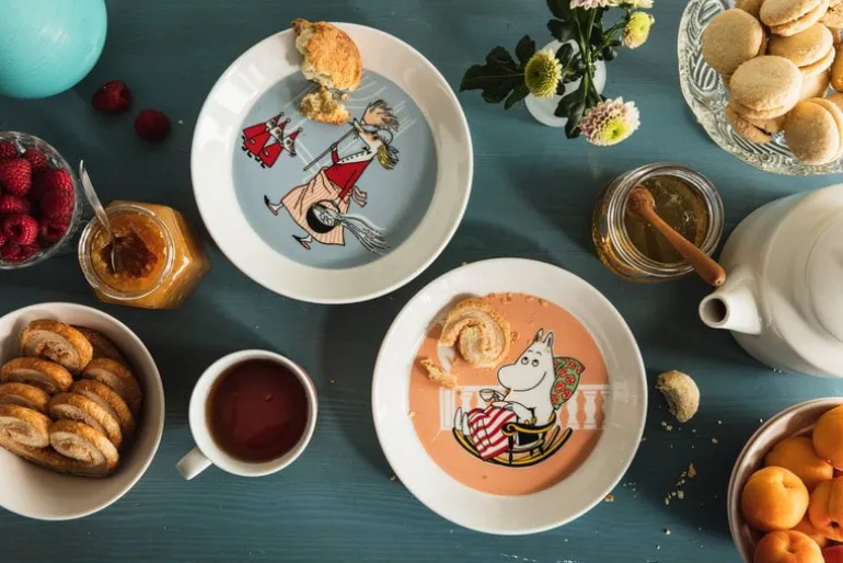 Muggarna, skålarna och tallrikarna i Arabias Moomin Classics-kollektion avbildar karaktärerna i Mumindalen. De första föremålen från Arabias Mumin-porslin släpptes redan på 1950-talet, och började produceras i större skala 1990. Alla illustrationerna skapas av Tove Slotte som hämtar inspiration från Tove Janssons original. Själva formen kommer från Arabias tidlösa Teema-porslin i keramik som designats av Kaj Franck.