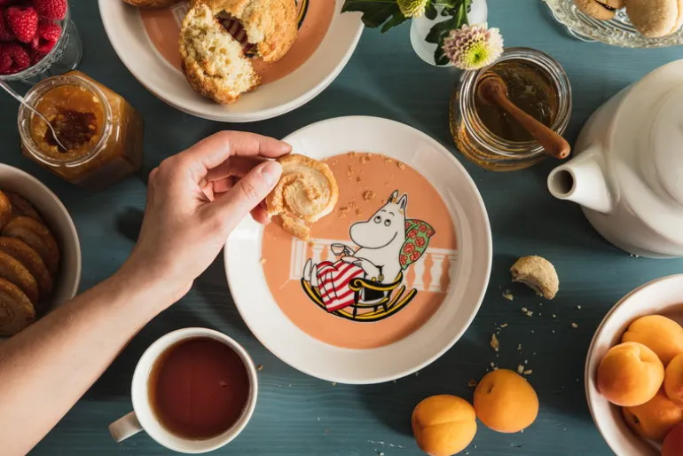 Muminmamma-tallriken, från Arabias Muminkollektion, bär en charmig illustration av Muminmamman som kopplar av i en gungstol med en kopp kaffe. Illustrationen fångar verkligen upp Muminmammans bohemiska inställning: hon besväras inte av småsaker och kan, när hon känner för det, ta en stund för sig själv.