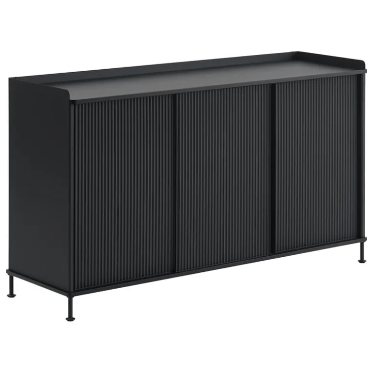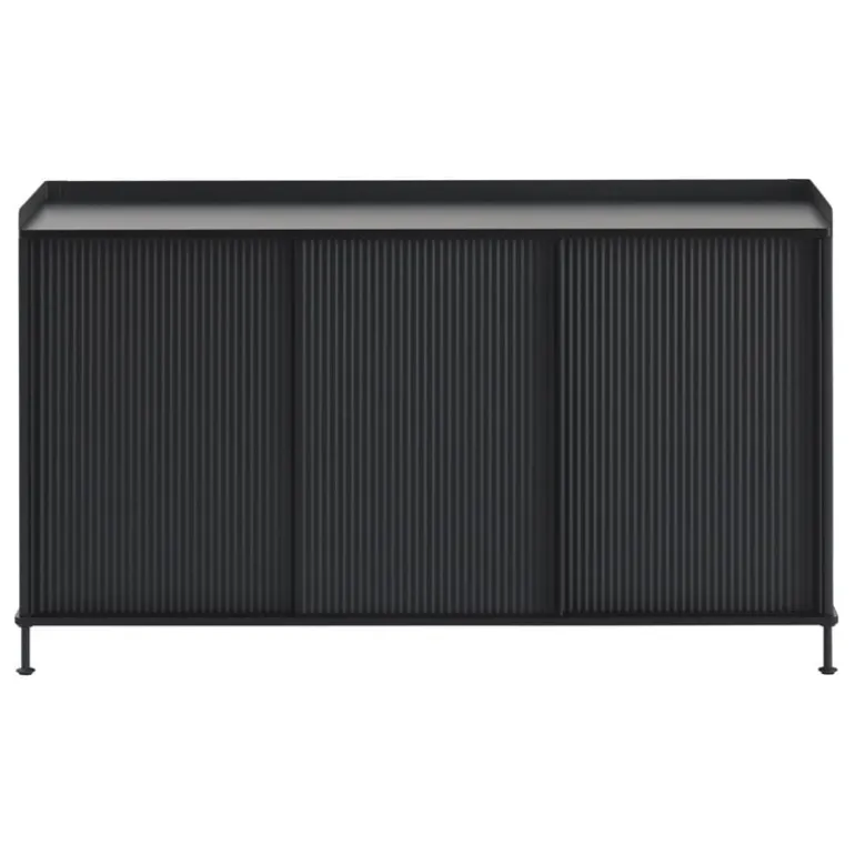 Sideboardet Enfold från Muuto utmärks av sin fina balans mellan industrianda och organiska detaljer. I sideboardet Enfold, designat av Thomas Bentzen, kombineras en botten- och toppskiva i massiv ek med skjutdörrar av pulverlackerat, veckat stål. Enfold utstrålar en lätthet som ger både hemmamiljön och kontoret ett fulländat intryck, och är lika lättmöblerad i vardagsrummet som i köket eller i hallen. I den låga varianten av sideboardet Enfold ingår en metallhylla, som kan placeras på önskad nivå bakom skjutdörrarna.