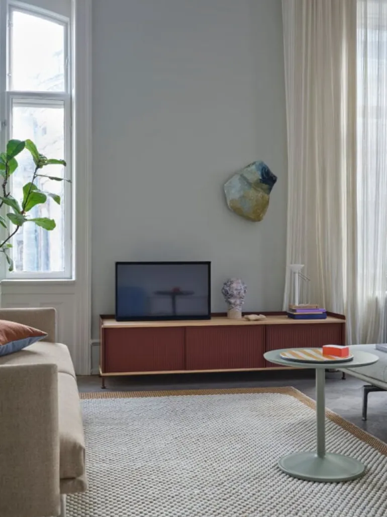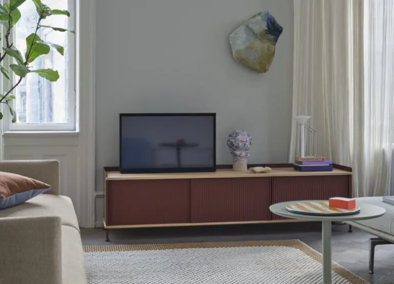 Sideboardet Enfold från Muuto utmärks av sin fina balans mellan industrianda och organiska detaljer. I sideboardet Enfold, designat av Thomas Bentzen, kombineras en botten- och toppskiva i massiv ek med skjutdörrar av pulverlackerat, veckat stål. Enfold utstrålar en lätthet som ger både hemmamiljön och kontoret ett fulländat intryck, och är lika lättmöblerad i vardagsrummet som i köket eller i hallen.