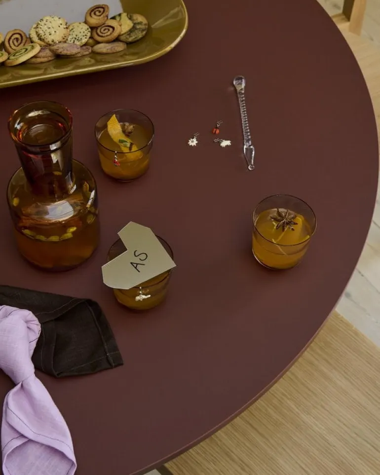 Muutos bord Midst, formgivet av TAF Studio, är ett runt matbord som för samman två olika material och texturer: den monolitiska underdelen i stål har en högglansig finish, medan bordsskivan är belagd med naturligt linoleum som gör att ytan blir silkesmatt.