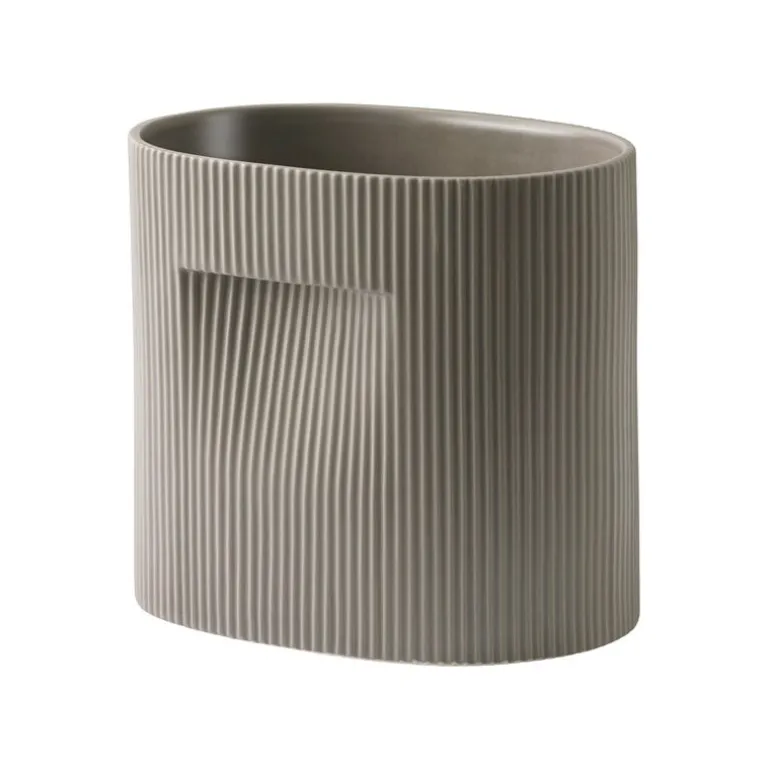 Tack vare krukans ovanliga form och kanten inuti öppningen kan Ridge-krukan användas på ett nytt sätt: istället för en bukett kan blommorna placeras i en rad. En intressant detalj i designen är de intryckta delarna på varje sida av krukan som, förutom att de framhäver formen och de vertikala linjerna, även fungerar som handtag för att hjälpa dig att flytta blomkrukan från en plats till en annan.