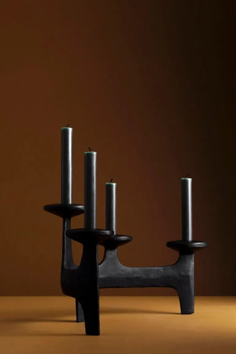 Kandelabern Nunatak, från Nedre Foss, kommer garanterat att skapa en festlig stämning vid olika tillfällen. Den fyrarmade kandelabern är tillverkad av stabilt gjutjärn och är designad av det norska designbolaget Anderssen & Voll. Den arkitektoniska, men ändå organiska formen kan uppfattas som en grupp med torn eller som de unika formerna av hjorthorn, beroende på betraktarens öga. Namnet på kandelabern kommer från Nordens naturlandskap – Nunatak syftar till en kulle eller ett berg omringat av glaciäris. Välj dina favoritljus av avsmalnande modell och låt det milda skenet förgylla ditt middagsbord eller vardagsrumsbord.
