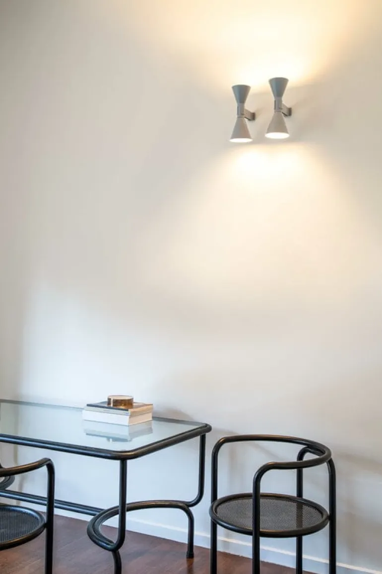 Applique de Marseille Mini från Nemo Lighting är en mindre version av den klassiska lampan, designad 1952. Den franske formgivaren Le Corbusier, en pionjär inom funktionell och modern design, formgav den ursprungliga vägglampan Applique de Marseille till sin egen lägenhet i Paris. Lampan består av två konformade aluminiumskärmar som riktar ljuset både uppåt och nedåt, vilket skapar tydliga och vackra ljusstrålar som lyfter fram interiören på ett intressant sätt. Den lilla lampan Applique de Marseille Mini är perfekt som läslampa i sovrummet, som spotlight i vardagsrummet eller som belysning i hallen.