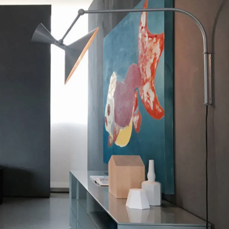 Nemo Lightings Lampe de Marseille Mini är en mindre version av den kända, skulpturala vägglampan formgiven av den världsberömda arkitekten Le Corbusier för Unité d’Habitation (en typ av flerbostadshus) i Marseille i början av 1950-talet. Det är enkelt att justera ljusets riktning tack vare att armen har två leder och kan vridas från sida till sida. Den slående skärmen består av två aluminiumkoner som erbjuder både direkt och indirekt ljus. Lampe de Marseille är en riktig statementlampa som har stått emot tidens tand, och kommer att göra det även i fortsättningen.