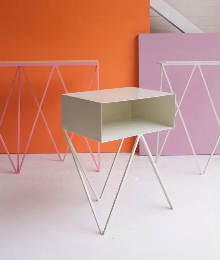 &News Robot är ett modernt sidobord som gör sig utmärkt som nattduksbord eller som praktisk möbel i hallen. Bordet har en öppen hylla och festliga sicksackben – formen är minimalistisk men spännande. Robot håller gärna plats åt dina favorittidningar, böcker och personliga föremål. Sidobordet är tillverkat av pulverlackerat stål, och höjden på hyllan är 17 cm. Alla möbler från &New görs för hand i Storbritannien.