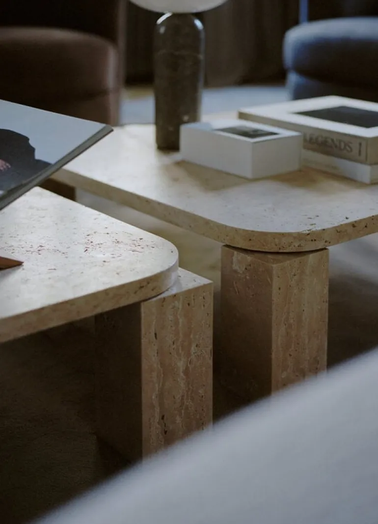 Det robusta soffbordet är tillverkat av ofylld travertin, som har använts som byggmaterial sedan antiken. Eftersom travertin är ett naturligt material, är dess färger och texturer alltid unika och varierar från ett bord till ett annat. Ofylld travertin har också små hål och fördjupningar på ytan, vilket ger Atlas-bordet mer karaktär och råhet.