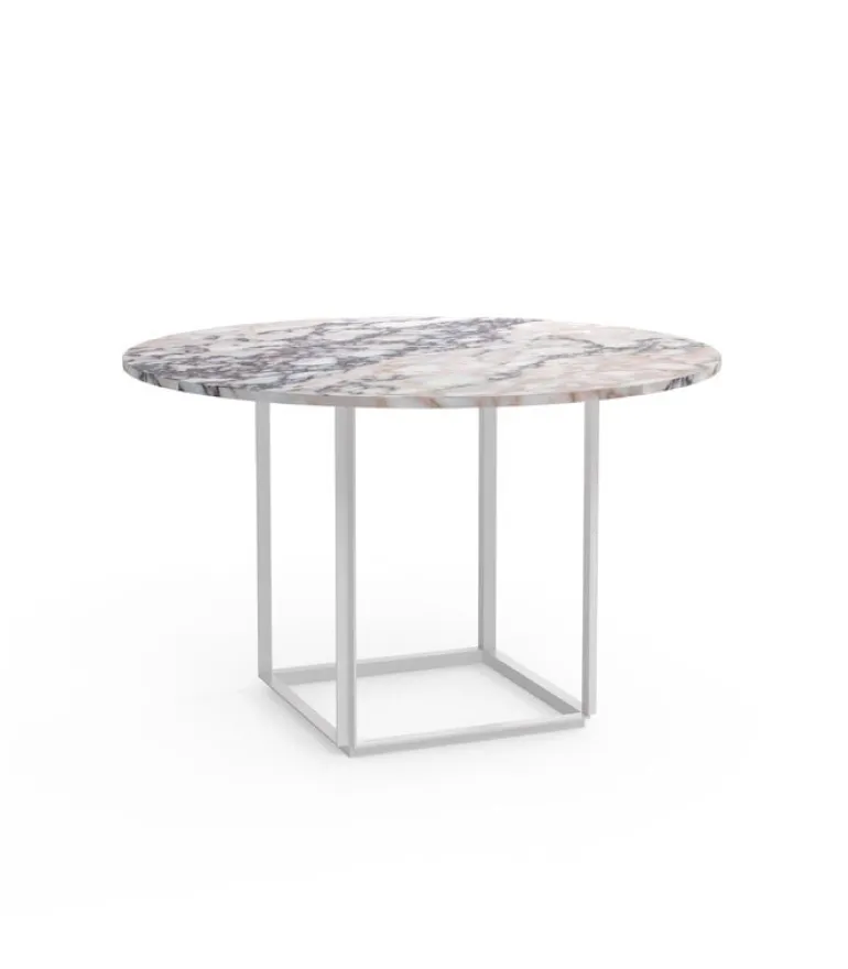 New Works matbord Florence består av en kubisk stålram som stöder en rund bordsskiva i starkt ådrad Viola-marmor. Det smala och unika Florence är ett utmärkt matbord i olika interiörer, från hushåll till caféer och restauranger.