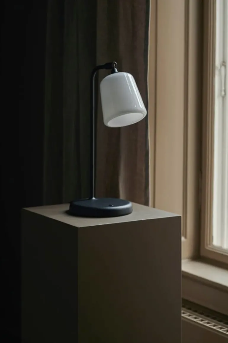Material bordslampan från New Works använder, som namnet avslöjar, flera olika material. Lamporna i Material-familjen delar alla samma form, men materialen varierar – från trä och metall till marmor, keramik och betong.