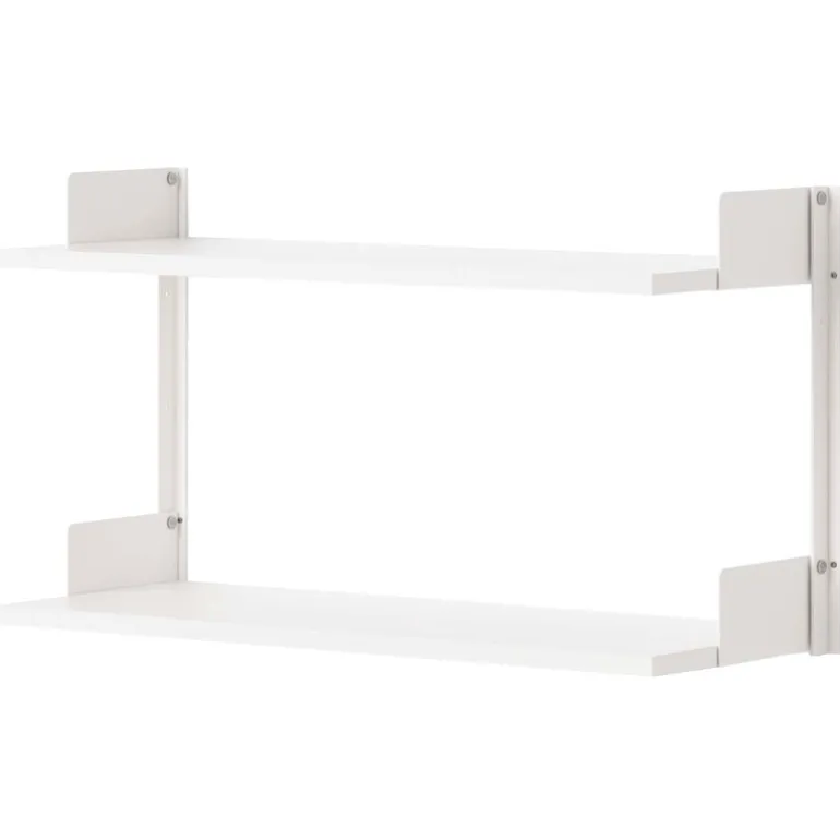 Detta New Works Wall-set består av två hyllor och aluminiumväggfästen. Båda hyllornas ändar har bokstöd för att hålla dina favoritföremål på plats – oavsett om du ställer upp böcker, porslin eller dekorativa föremål. Namnet 450 hänvisar till hyllans höjd, som är strax över 45 centimeter.