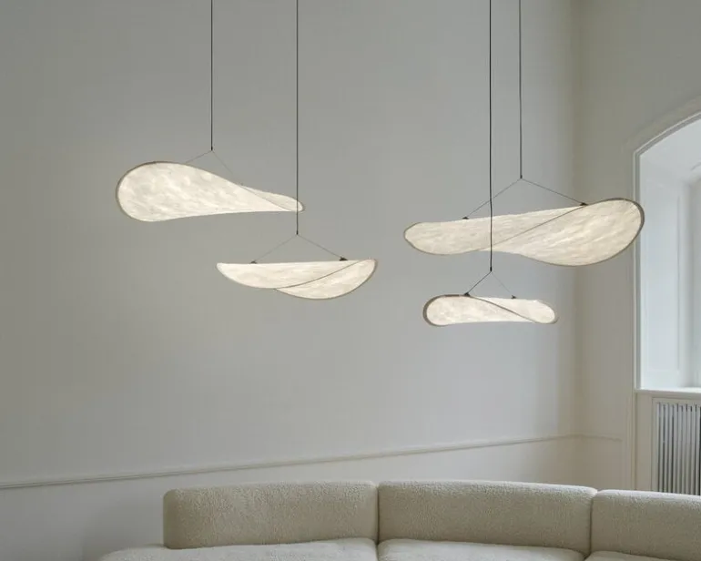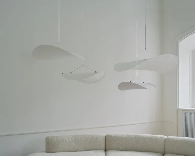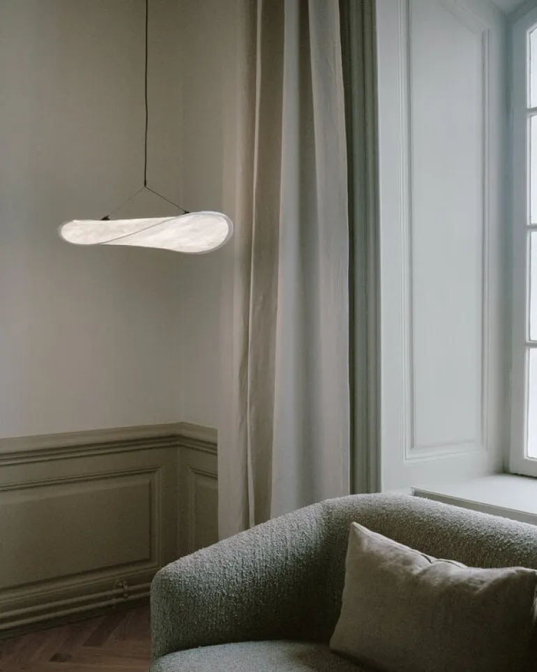 Taklampan Tense från New Works är som ett moln som svävar mitt i rummet och skapar ett mjukt ljus och en etisk atmosfär i alla utrymmen. Tense är designad av Panter & Tourron och är tillverkad av återvunnet Tyvek, ett material som filtrerar ljus på samma sätt som papper eller tunn textil.