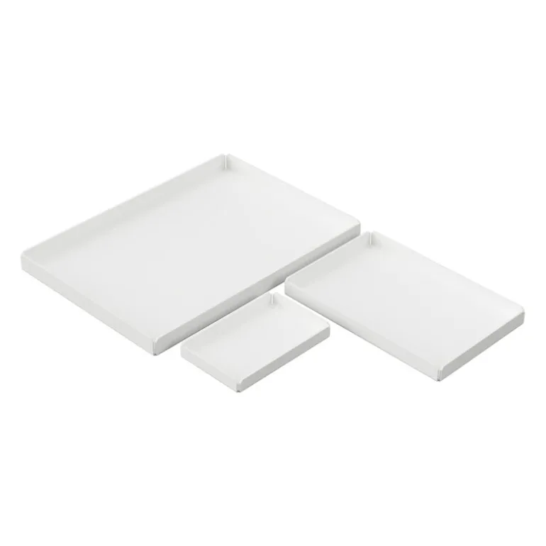 Nichbas brickset består av tre brickor i olika storlekar som skänker stil och ordning till alla hemmets rum. Dessa brickor i pulverlackerat stål med kant är designade av Pilgaard Design Studio och är perfekta för att servera små snacks, visa upp vackra föremål, organisera en arbetsstation eller förvara badrumsartiklar. Brickorna är tillverkade i Danmark och har en hållbar och minimalistisk design.
