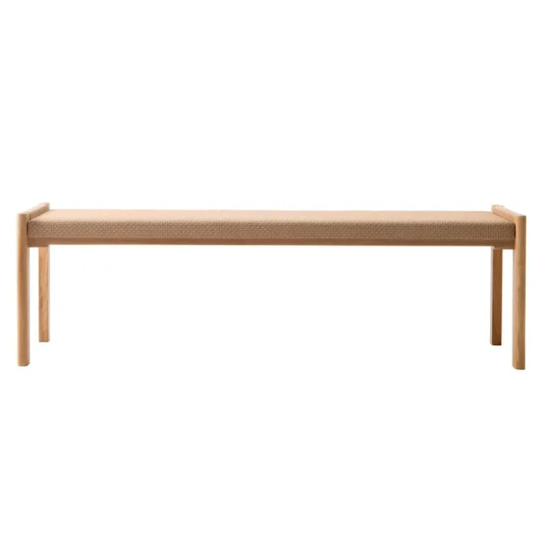 Nikaris Detalji-bänk kombinerar några av de finaste elementen inom finskt trä- och textildesign. Bänken, som är designad av Jenni Roininen, är tillverkad i ek och klädd i ett tyg av papperssnöre som Ritva Puotila har designat för Woodnotes. Tyget Woodpecker har spunnts och vävts i den finska regionen Österbotten. Dessutom pryds ändarna på bänken av en naturlig väv av papperssnöre. Den balanserade designen, den livfulla texturen och de vackra detaljerna på Detalji-bänken, som lanserades 2021, gör den till en älskad och långvarig möbel i en mängd olika hem och inredningar.