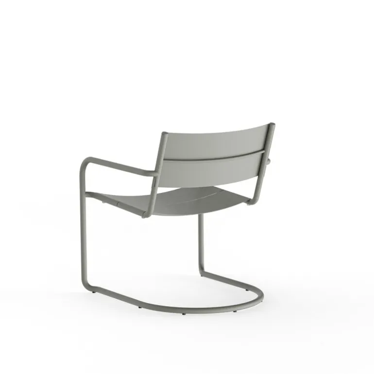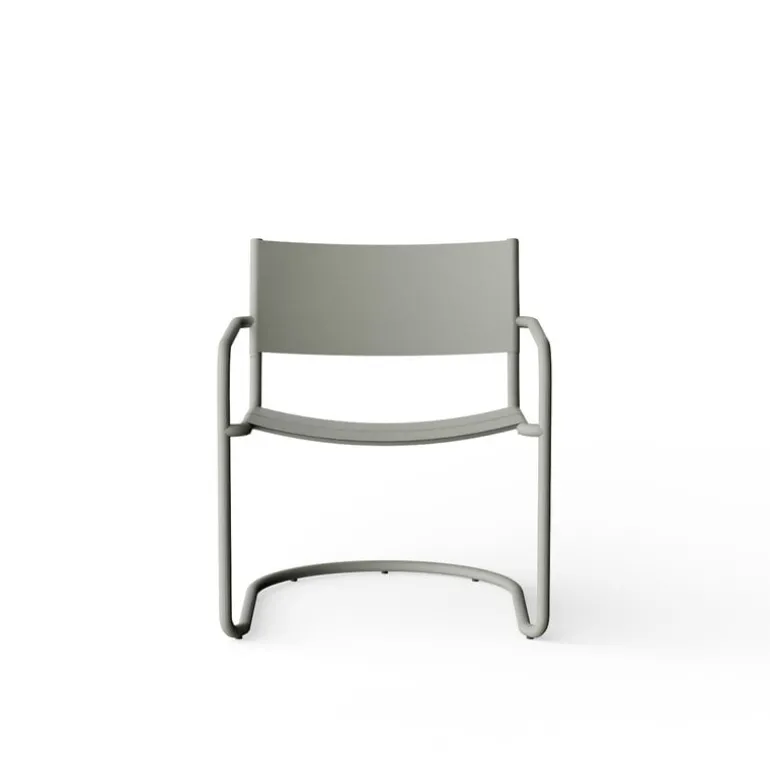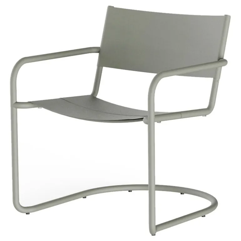 Nines Sine lounge chair är en elegant fåtölj i rostfritt stål som sticker ut med sitt rörformade fribärande underrede, vilket ger den ett elegant utseende och en något flexibel sittupplevelse. Den bekvämt böjda sitsen och ryggstödet är tillverkade av tunna metallplåtar med springor som möjliggör snabb torkning efter ett skyfall.