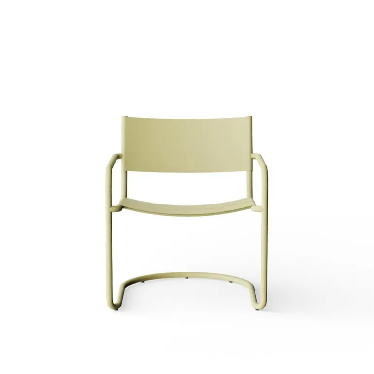 Nines Sine lounge chair är en elegant fåtölj i rostfritt stål som sticker ut med sitt rörformade fribärande underrede, vilket ger den ett elegant utseende och en något flexibel sittupplevelse. Den bekvämt böjda sitsen och ryggstödet är tillverkade av tunna metallplåtar med springor som möjliggör snabb torkning efter ett skyfall.