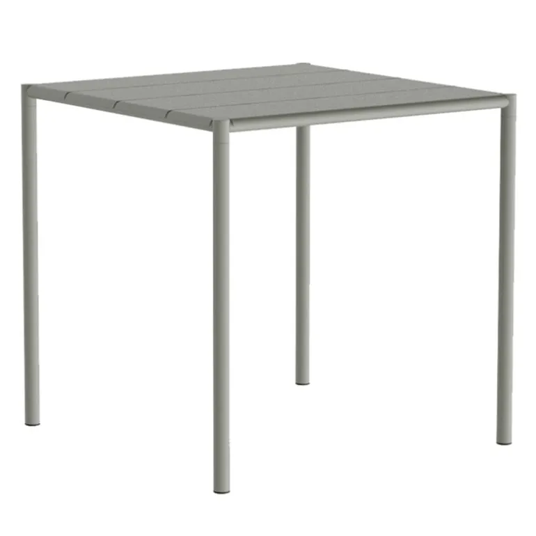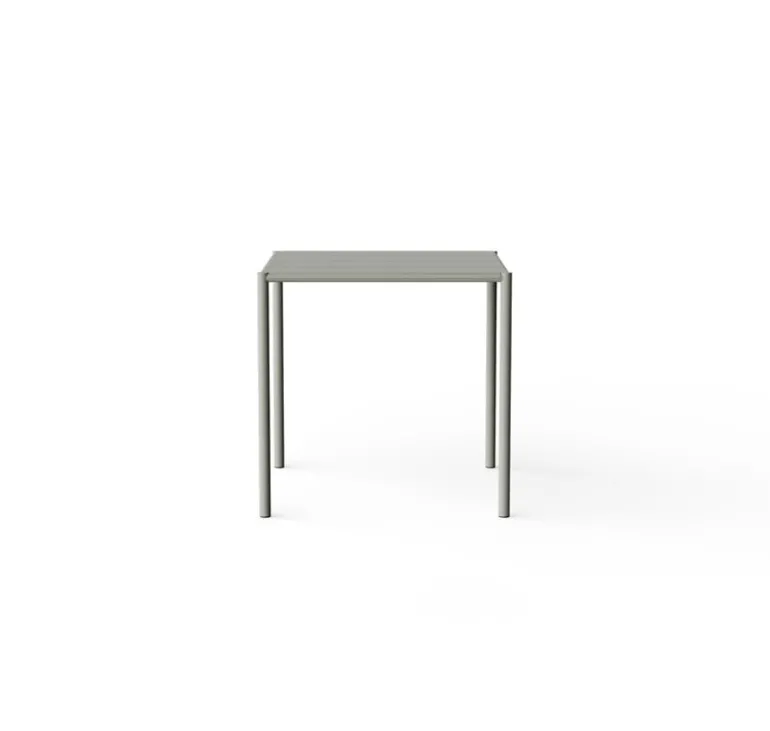 Nines Sine matbord är ett elegant uteplatsbord i rostfritt stål som sticker ut med sina rörformade ben, vilket ger det ett elegant utseende och en robust struktur. Den lilla, kvadratiska bordsskivan är tillverkad av tunna metallplåtar med springor som gör att den snabbt kan torka efter ett skyfall.