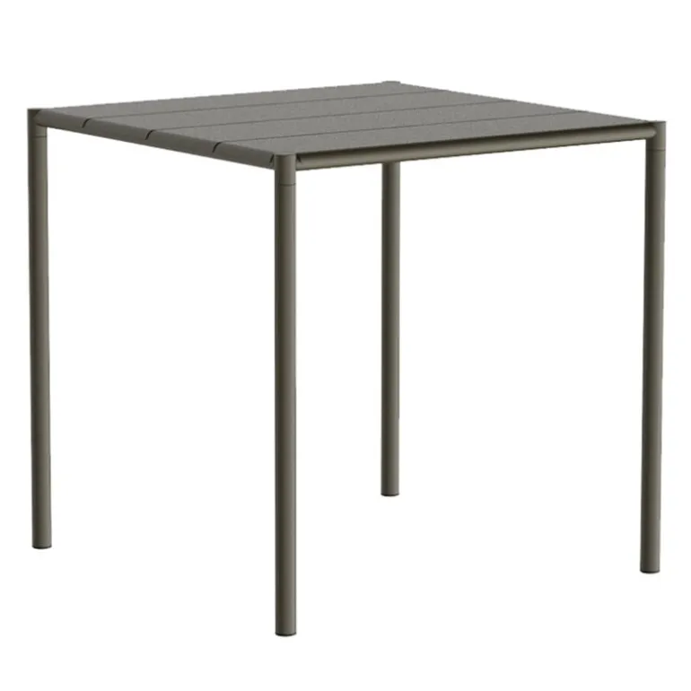 Nines Sine matbord är ett elegant uteplatsbord i rostfritt stål som sticker ut med sina rörformade ben, vilket ger det ett elegant utseende och en robust struktur. Den lilla, kvadratiska bordsskivan är tillverkad av tunna metallplåtar med springor som gör att den snabbt kan torka efter ett skyfall.
