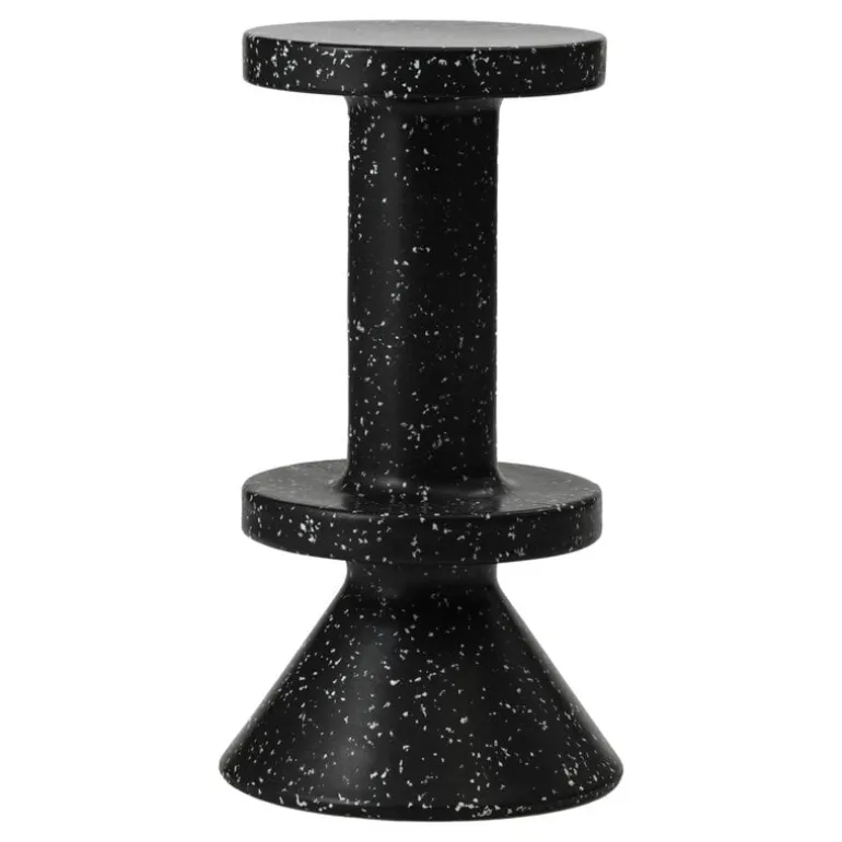 Barstolen är tillverkad av återvunnen plast, och dess monolitiska form har fått liv genom en prickig yta som kommer från materialet: under tillverkningsprocessen smälter färgglada plastbitar samman på varje stol på ett något annorlunda sätt. Därför är varje Bit-stol unik.