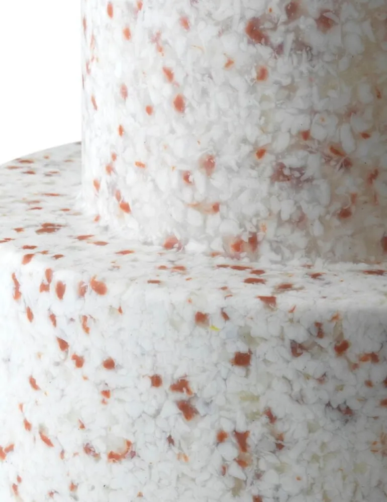 Normann Copenhagens pall Bit är en härligt distinkt möbel med många användningsområden som kan användas som sittplats, sidobord och en plats att förvara blommor och gröna växter. Pallen är designad av Simon Legald och tillverkad av återvunnen plast. Den monolitiska formen får liv av en prickig yta som kommer från materialet. Under produktionsprocessen smälts plastbitar i olika färger ner och ger varje stol ett unikt utseende. Därför är också varje pall unik.