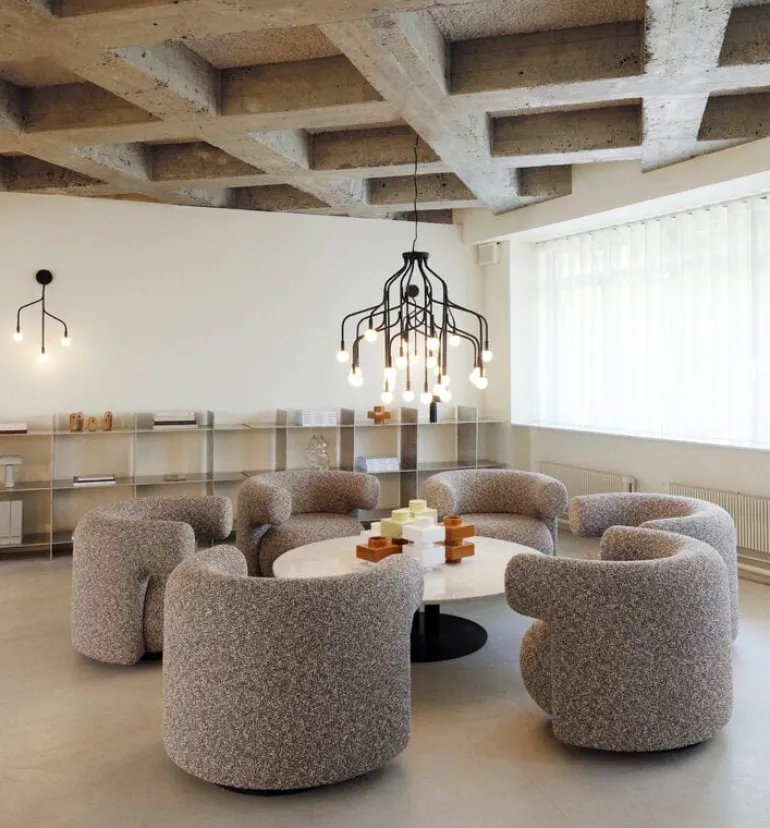 Burra-fåtöljen designades av Simon Legald och fick sitt namn från den älskade italienska burrata-osten. Dess runda form påminner om en gigantisk burrataboll, och även i sin mjukhet är Burra lik sin italienska inspiration. Den lågprofilerade designen garanterar att fåtöljen ger en känsla av lätthet snarare än tyngd. Fåtöljen kan på egen hand enkelt hamna i strålkastarljuset med sin uttrycksfulla design, men flera Burras passar även ihop i grupp.