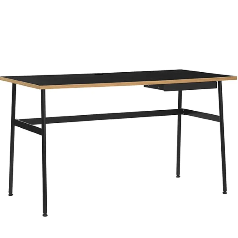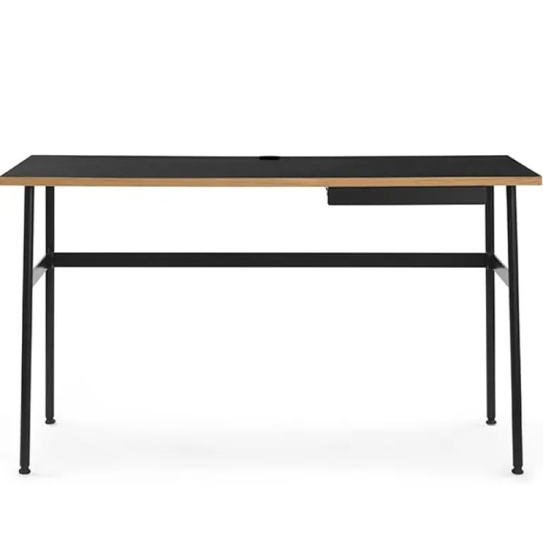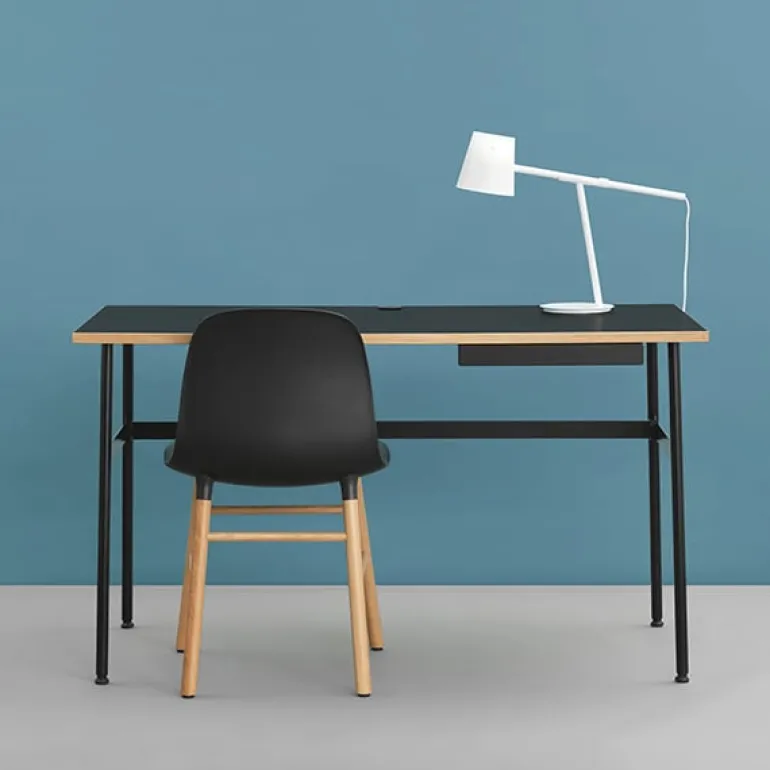 Journal, designad av Simon Legald för Normann Copenhagen, är ett snyggt, kompakt skrivbord som består av en laminerad bordsskiva och smala ben i pulverlackerat stål. Den integrerade kabeldragningen leder nätkablarna snyggt in under skrivbordet, och dokument och kontorsmaterial ryms perfekt i den smala lådan. Journals enkla och vackra design är väl lämpad för att skapa en trevlig arbetsmiljö.