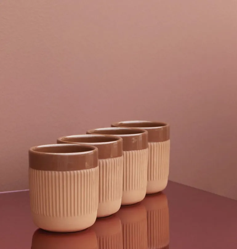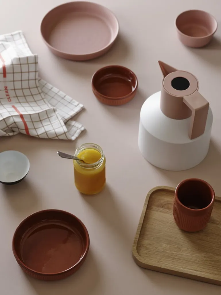 Junto-kollektionens dynamiska utseende har sin grund i växlingen mellan olika texturer: muggarna och karaffen finns med både matt och glaserad yta, men kan också ha en slät eller räfflad utsida. Junto skänker en härligt avspänd, sydeuropeisk atmosfär till skandinaviska inredningar och olika bordsdukningar.