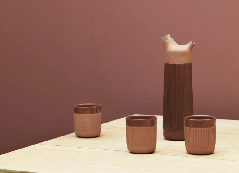 Inspirationen till muggen Junto, formgiven av Simon Legald för Normann Copenhagen, har hämtats från de traditionella, spanska karafferna som kallas för botijo. I likhet med traditionella botijos är Junto-muggarna gjorda av terrakottalera, som ger dem en rustik, varm karaktär, och de hjälper även till med att hålla dryckerna kalla längre. Själva materialet gör att nyansen på muggen kan variera en aning, vilket förstärker känslan av att den tillverkats för hand: den rödaktiga färgtonen kan dra mot varmt orange eller mot lite mörkare brunt.