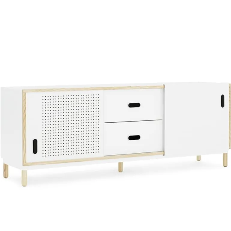 Sideboardet Kabino från Normann Copenhagen består av två snygga lådor och dörrar i metall, och på baksidan finns det en genomgång för kablar. Kabinos förvaringsmöbler är designade av Simon Legald och kännetecknas av en urban, industriell look som mjukas upp av de ljusa trädetaljerna. Tack vare det stilrena, enkla utseendet kan möblerna i Kabino-kollektionen användas på kontoret, i köket och i hallen. Det går även att stapla Kabino-möblerna på varandra om man tar bort benen.