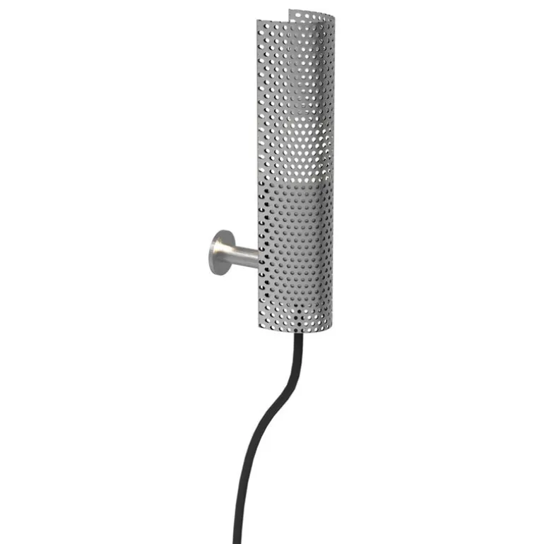 The Radent Wall Torch från NUAD är tillverkad av perforerat stål och aluminium. Den diskreta armaturen ger en subtil belysning som reflekteras mot väggen och även filtreras genom den böjda skärmen i metallnät. Den lilla vägglampan Radent är enkel och diskret och passar perfekt vid sängkanten, i hallen eller i trapphuset. Den industriella lampan är också enkel att se framför sig som dekorativ belysning i hotell, restauranger eller barer.