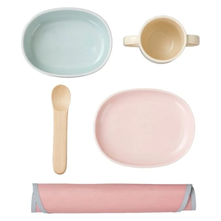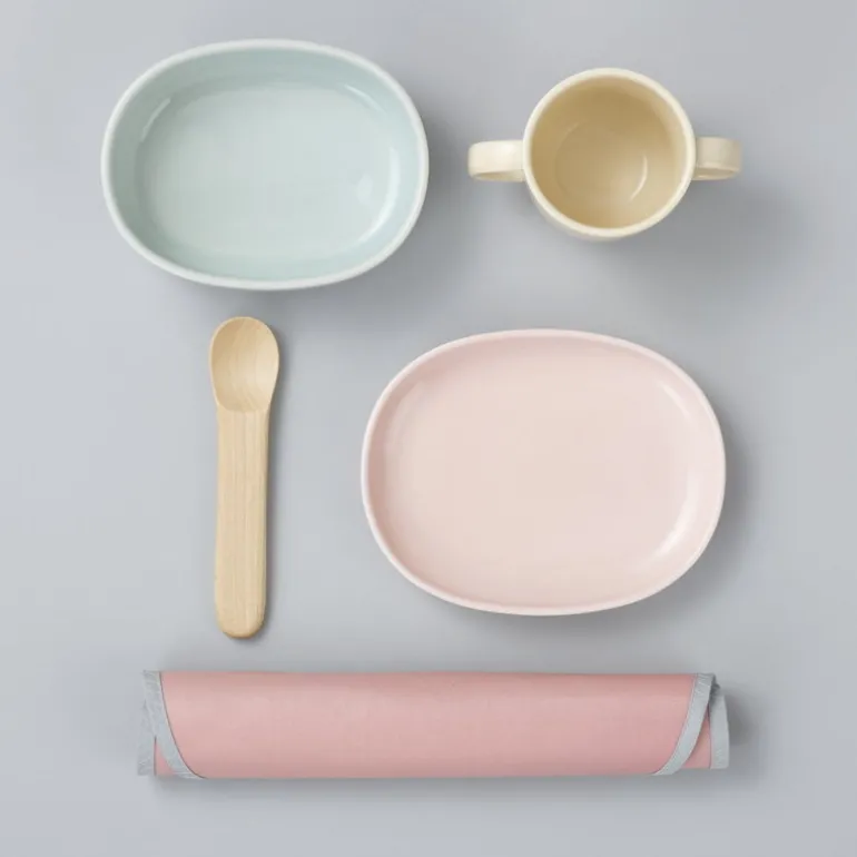 I servisen från Nuppu ingår en keramikmugg, skål, tallrik och en charmig sked i trä. Dessutom medföljer en matchande och praktisk haklapp. Produkternas storlekar och vackra rundade former har utformats omsorgsfullt. De ska inte bara vara praktiska utan även passa behoven hos barn i olika åldrar. Muggen har till exempel två stycken handtag, vilket gör den lätt att dricka ur. Träskeden skramlar inte mot skålen eller tallriken under tiden barnet lär sig att använda den. Rester kan sparas i skålen och då fungerar tallriken som ett lock.