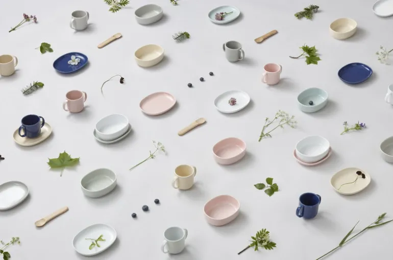 I servisen från Nuppu ingår en keramikmugg, skål, tallrik och en charmig sked i trä. Dessutom medföljer en matchande och praktisk haklapp. Produkternas storlekar och vackra rundade former har utformats omsorgsfullt. De ska inte bara vara praktiska utan även passa behoven hos barn i olika åldrar. Muggen har till exempel två stycken handtag, vilket gör den lätt att dricka ur. Träskeden skramlar inte mot skålen eller tallriken under tiden barnet lär sig att använda den. Rester kan sparas i skålen och då fungerar tallriken som ett lock.