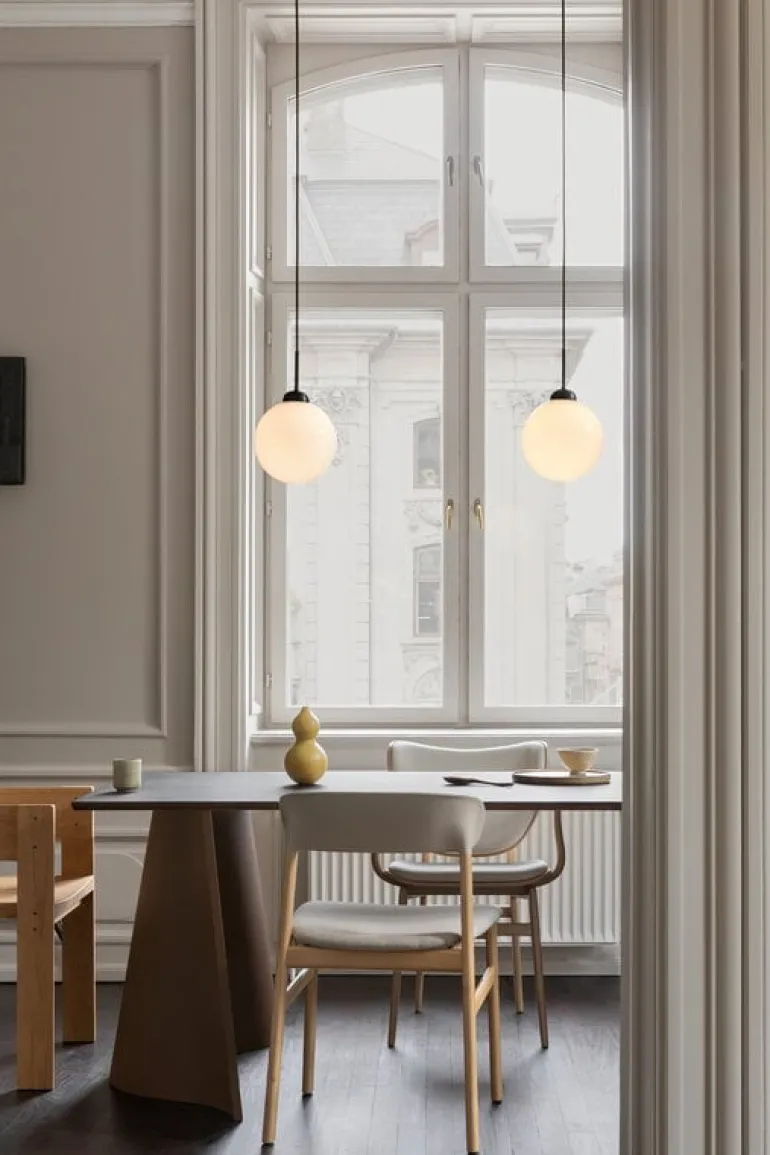 Pendellampan Apiales, formgiven av Sofie Refer för det danska varumärket Nuura, har inspirerats av blommornas former. Den minimalistiska pendellampan har en slank metallbas och en rund opalglaskupol som filtrerar ljuset på ett mjukt och delikat sätt.