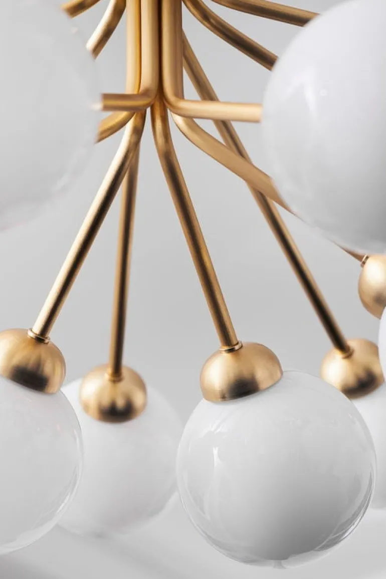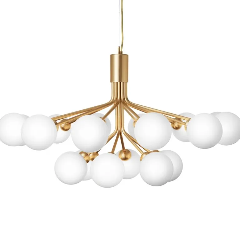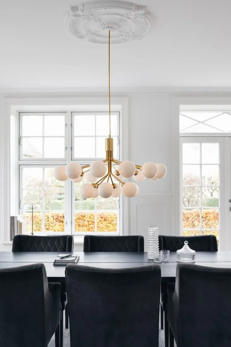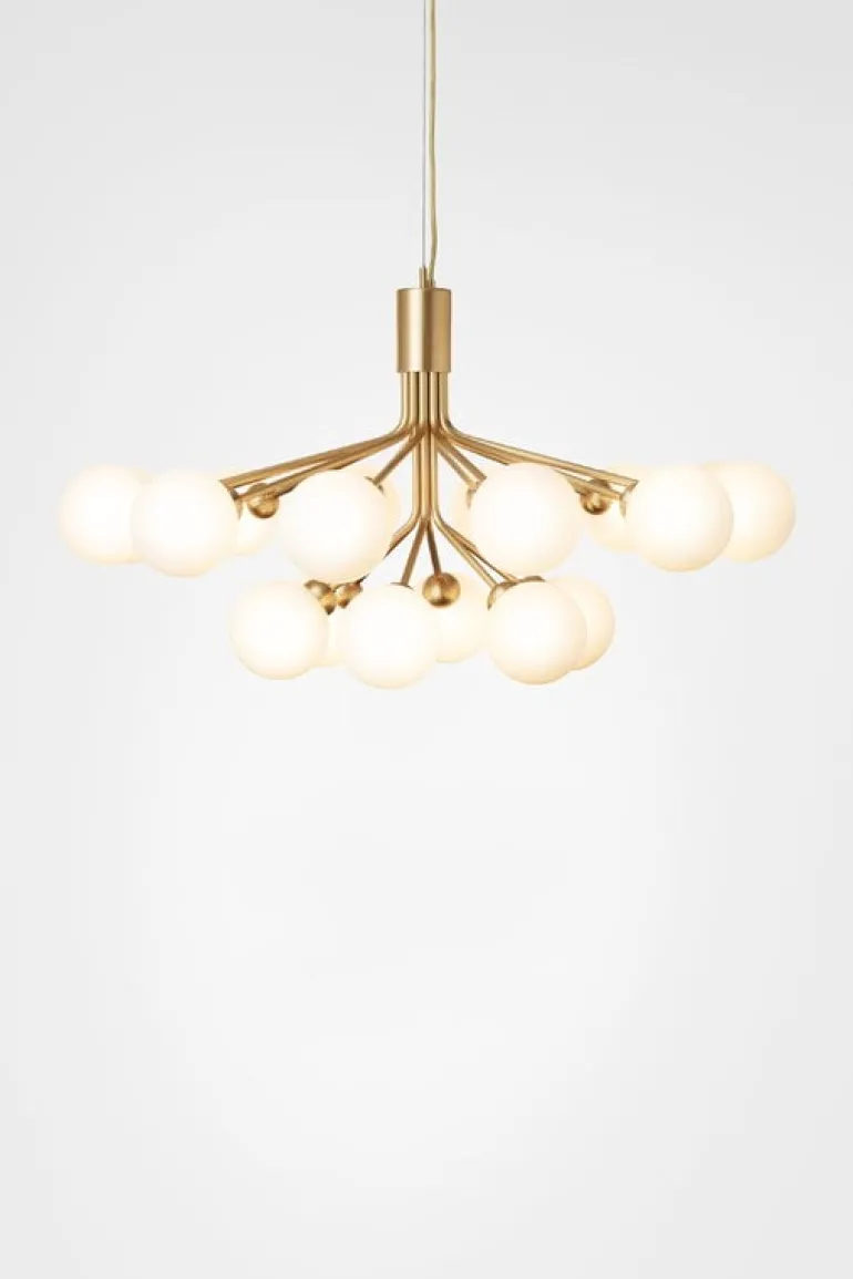 Apiales är designad av Sofie Refer för danska Nuura och är en bedårande, modern ljuskrona som är inspirerad av blomklungor. Pendellampans stora, men slanka, metallram har arton runda munblåsta glaskupor som mjukt och fint filtrerar ljuset. Apiales 18 har en diameter på 90 cm och fångar blicken, exempelvis, ovanför matbordet eller som mittpunkt i ett stort vardagsrum eller en rejäl hall.