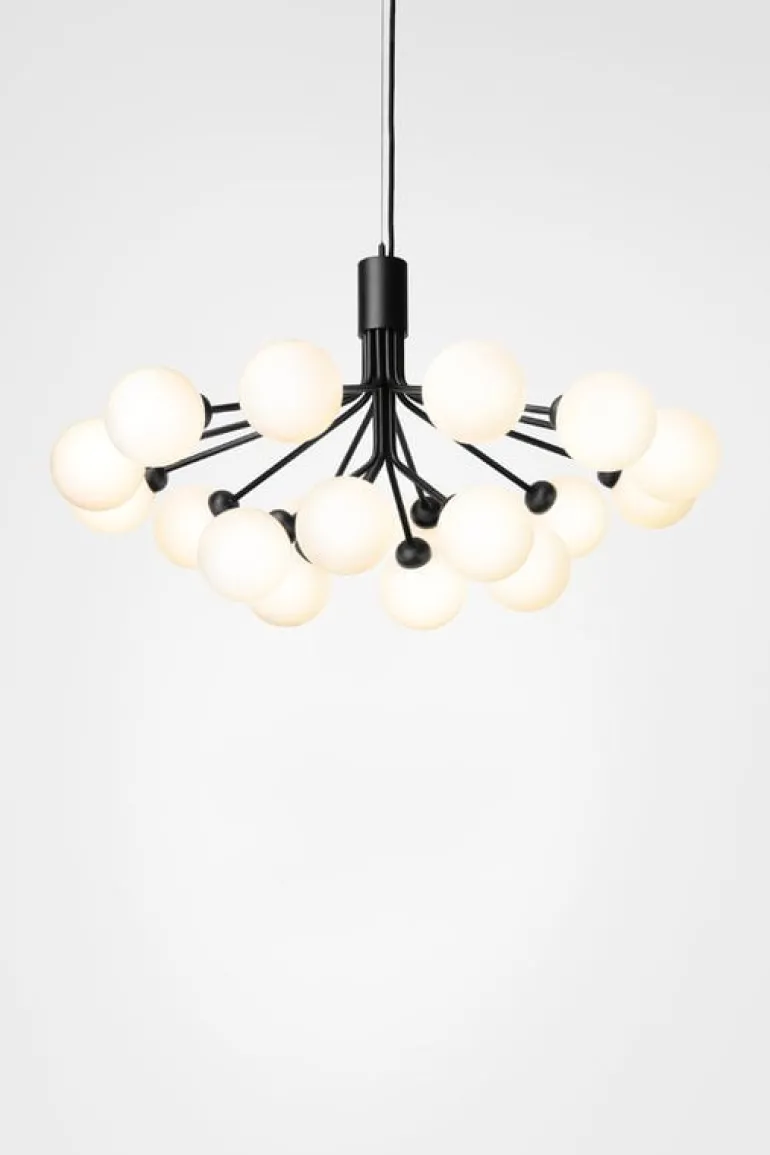Apiales är designad av Sofie Refer för danska Nuura och är en bedårande, modern ljuskrona som är inspirerad av blomklungor. Pendellampans stora, men slanka, metallram har arton runda munblåsta glaskupor som mjukt och fint filtrerar ljuset. Apiales 18 har en diameter på 90 cm och fångar blicken, exempelvis, ovanför matbordet eller som mittpunkt i ett stort vardagsrum eller en rejäl hall.