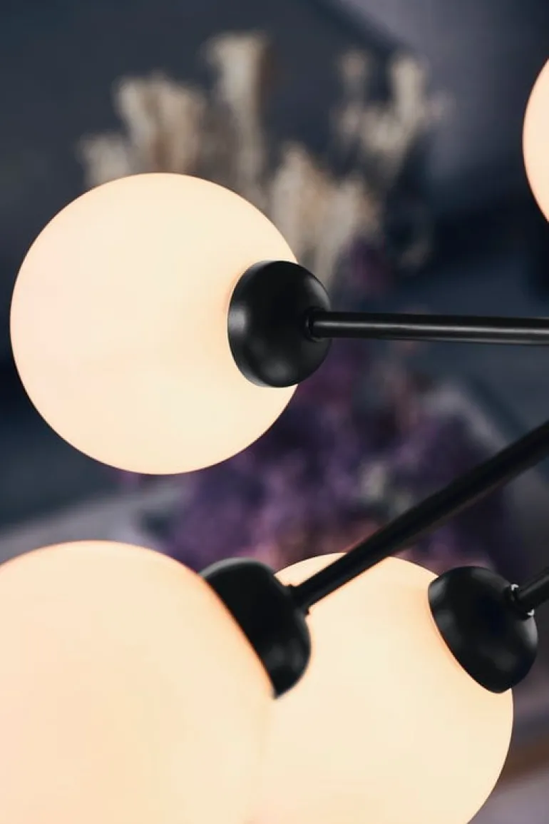 Apiales är designad av Sofie Refer för danska Nuura och är en bedårande, modern ljuskrona som är inspirerad av blomklungor. Pendellampans stora, men slanka, metallram har nio runda munblåsta glaskupor som mjukt och fint filtrerar ljuset. Apiales 9 har en diameter på 60 cm och fångar betraktarens öga, exempelvis ovanför matbordet eller som mittpunkt i vardagsrummet.