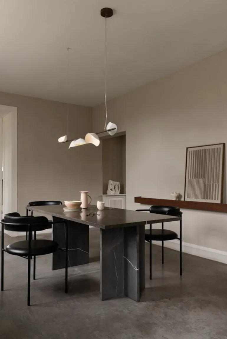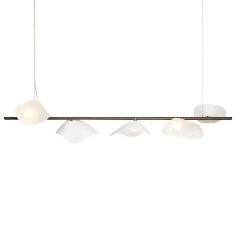 Nuuras pendellampa Florii 5 Linear har organiska former och ger ifrån sig ett mjukt ljus i alla utrymmen, vilket gör den perfekt för att lysa upp ett matbord, köksö eller vardagsrum. Taklampan Florii 5 kombinerar en mörk, bronsfärgad metallkropp med fem fint utformade glasskärmar, som sprider ljuset både nedåt och åt sidorna. Den har inbyggda LED-moduler som kan bytas ut när de når slutet av sin livslängd.
