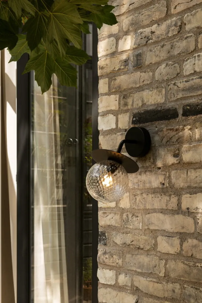 Nuuros vägglampa Liila Outdoor är speciellt framtagen för utemiljöer, som runt entréer och på husfasader. Lampan, som har skapats av den prisbelönta danska lampdesignern Sofie Refer, består av en rund, munblåst glasglob och en robust, men på samma gång graciös metallstomme. Den genomskinliga, texturerade skärmen skapar ett vackert, dekorativt mönster kring lampan.