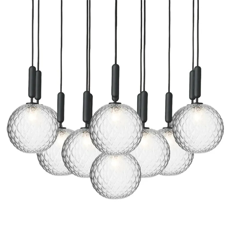 Miira 13 är en pendellampa från det danska märket Nuura – det är en underbar, modern ljuskrona. Miira 13 drar blickarna till sig – de hängande, präglade glaskupolerna sprider ett stämningsfullt ljus, medan den eleganta metallbasen skapar en genomtänkt kontrast i designen. Den stora pendellampan Miira 13 har en total bredd på 98 cm, och med hjälp av vajersystemet kan du justera höjden på varje glaskupol upp till 250 cm.