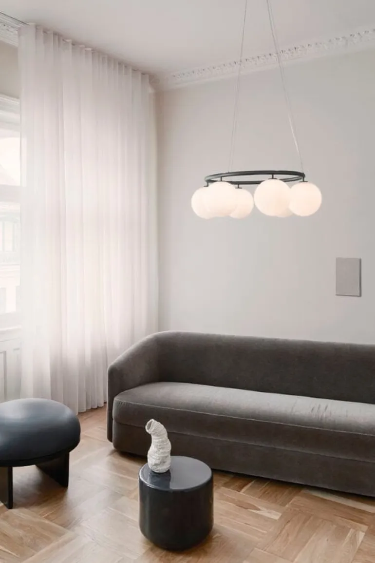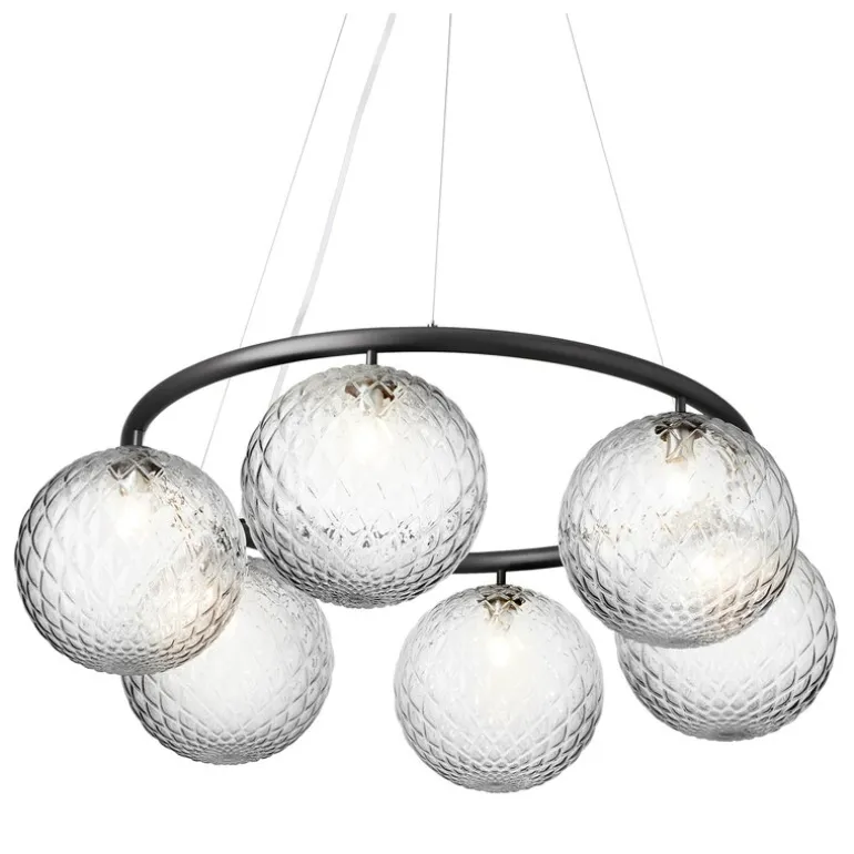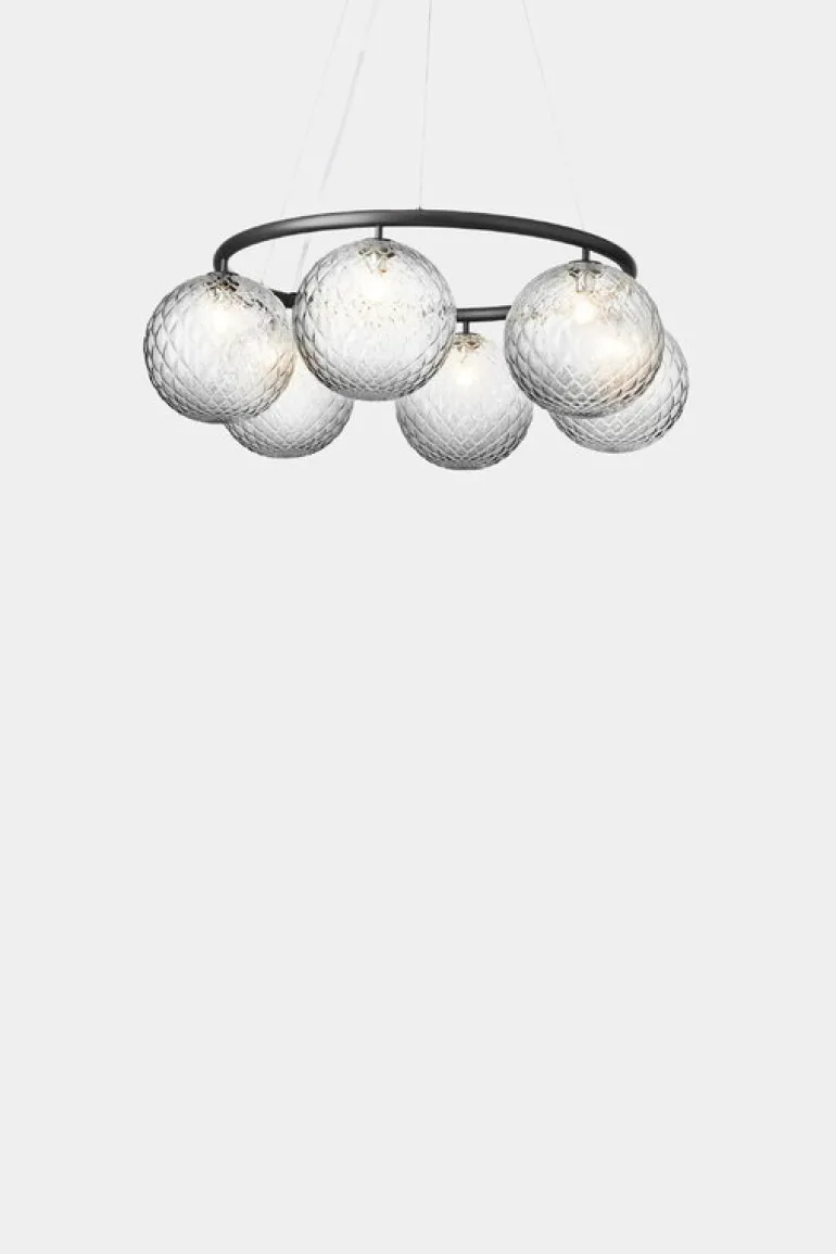 Taklampan Miira 6 Circular från det danska märket Nuura är en fantastisk, modern ljuskrona. Den fångar blicken med vackert formade präglade glaskupor som kastar ett atmosfäriskt ljus, med den eleganta metallringen som ger en genomtänkt kontrast till designen. Miira 6 Circular har en diameter på 80 cm, och dess trådsystem gör att du kan justera höjden mellan 20 och 250 cm.