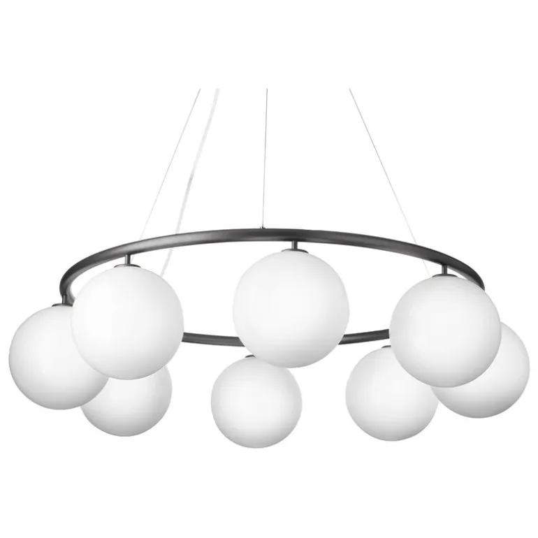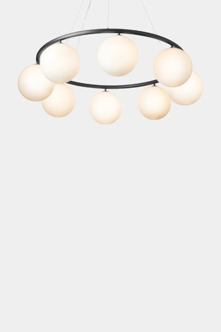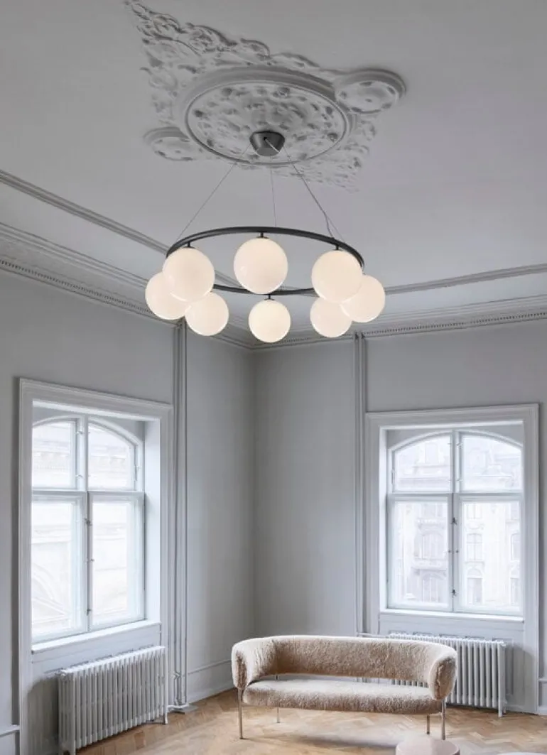 Den cirkulära pendellampan Miira 8 från det danska märket Nuura är en fantastisk, modern ljuskrona. Den fångar blicken med vackert formade opalglasdomer som kastar ett atmosfäriskt ljus, med den eleganta metallringen som ger en genomtänkt kontrast till designen. Miira 8 Circular har en diameter på 100 cm, och dess trådsystem gör att du kan justera höjden mellan 20 och 250 cm.