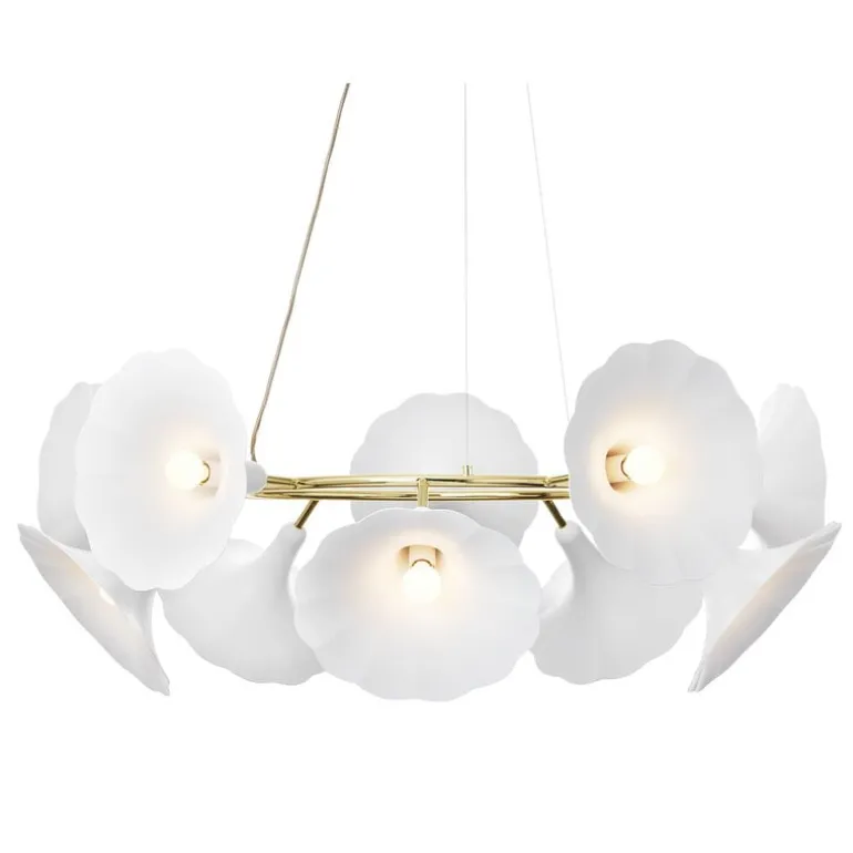 Nuuras Petalii 10 pendellampa är en modern ljuskrona som utstrålar romantisk charm med sin krans av klockformade skärmar. Den fängslande armaturen består av tio vita metallblommor som är elegant arrangerade på en mässingsfärgad bas. Den utgör ett fantastiskt blickfång i vardagsrummet eller lobbyn och kan också placeras ovanför ett matbord eller en säng.