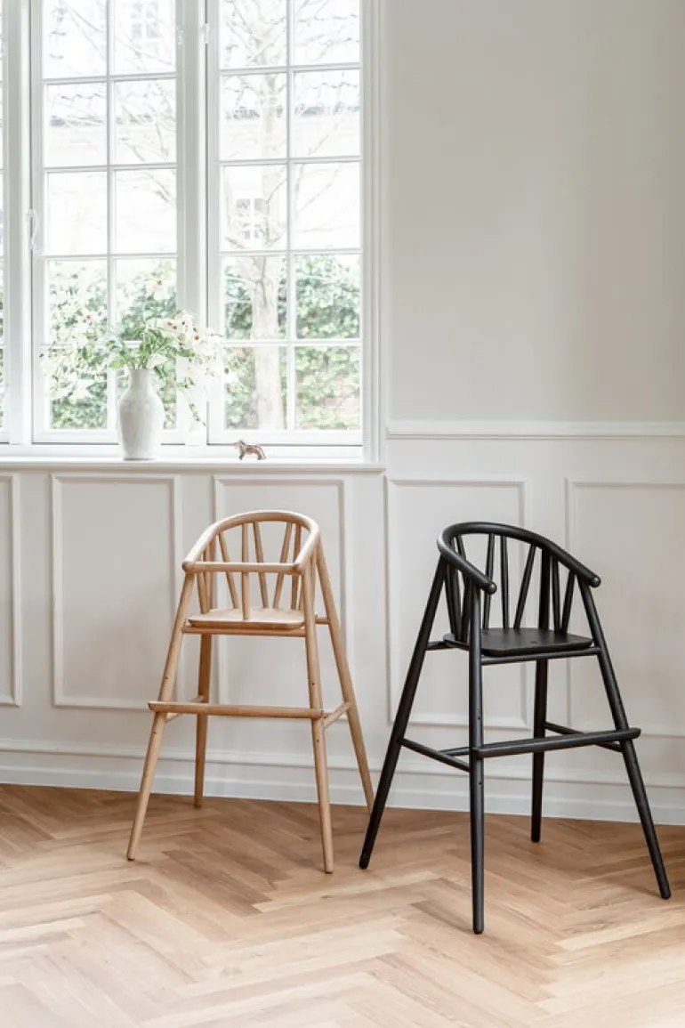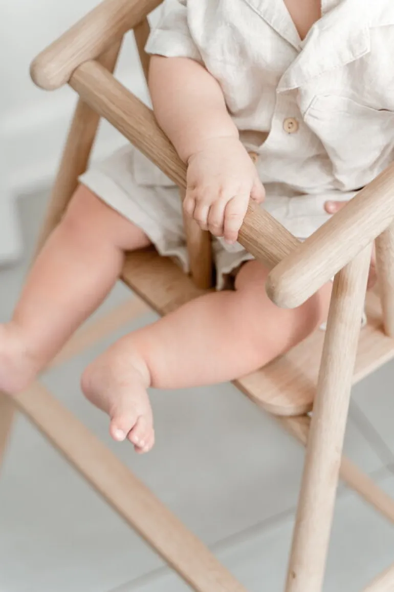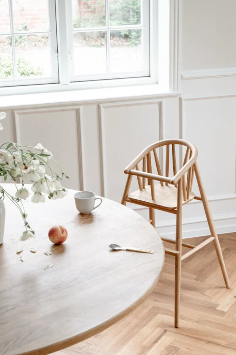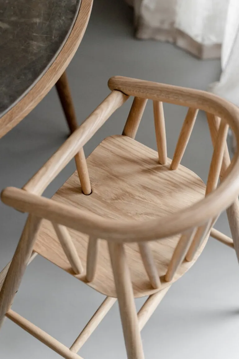 Den här barnstolen i massivt trä är formgiven av Nina Bruun. Den är byggd för att hålla länge – att lämnas vidare från ett syskon till ett annat, från en generation till nästa. Som en extra finess har stolen försetts med en uppsättning mässingsplattor, på vilka man kan gravera in namnen på barnen som har använt stolen eller andra små meddelanden. Stolens mjukt välvda linjer kompletterar perfekt den övergripande designestetiken för hela Oaklings produktfamilj.