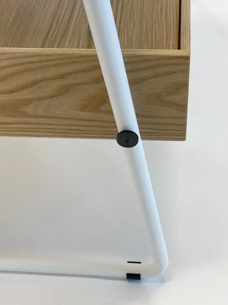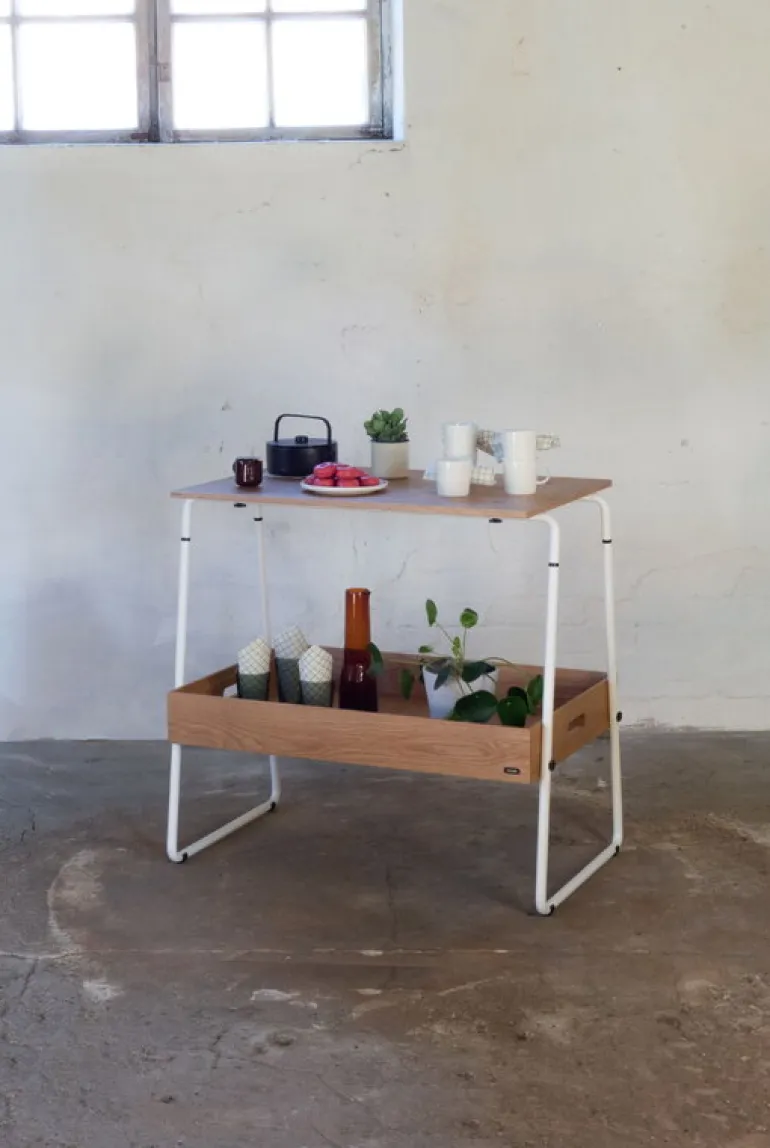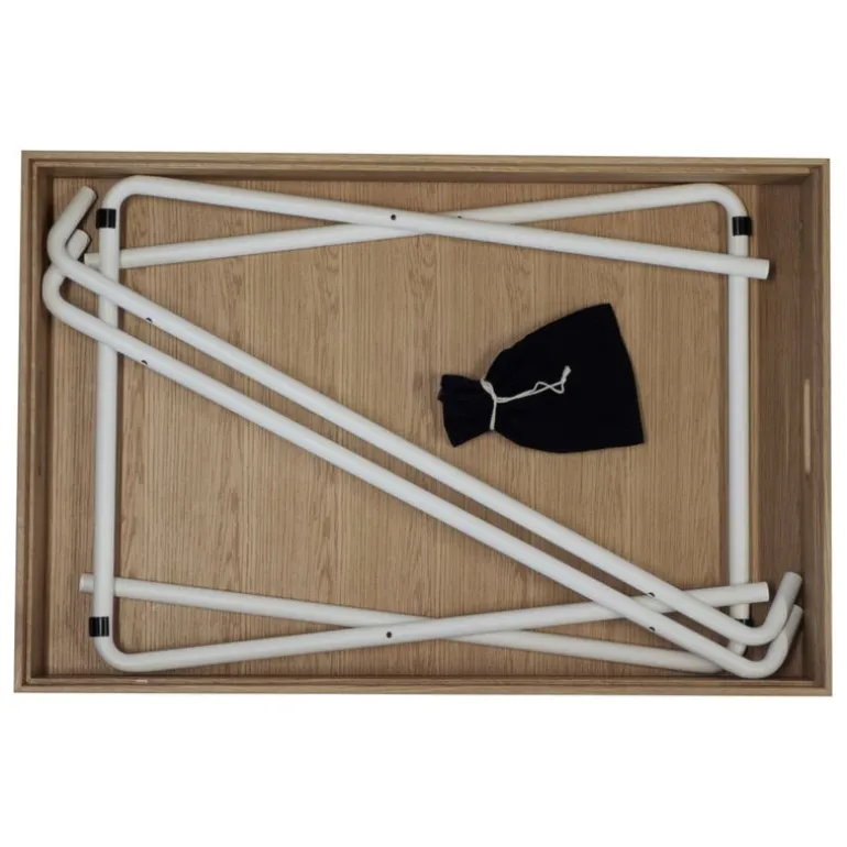 Den minimalistiska disken är tillverkad av ek och stål och får plats i små utrymmen för förvaring eller transport: metalldelarna inuti korgens trälåda fungerar som diskens två hjul. Disken är enkel att sätta ihop och ta isär helt utan verktyg och det tar endast ett par minuter. OOJA Displays disk är tillverkad i Finland.